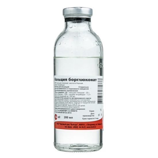 - Кальция борглюконат, подогретый до температуры 35-37°С, вводят животным внутривенно (медленно) или подкожно из расчета 0,5 мл/кг массы животного. При подкожном введении дозу препарата вводят дробно в разные места.